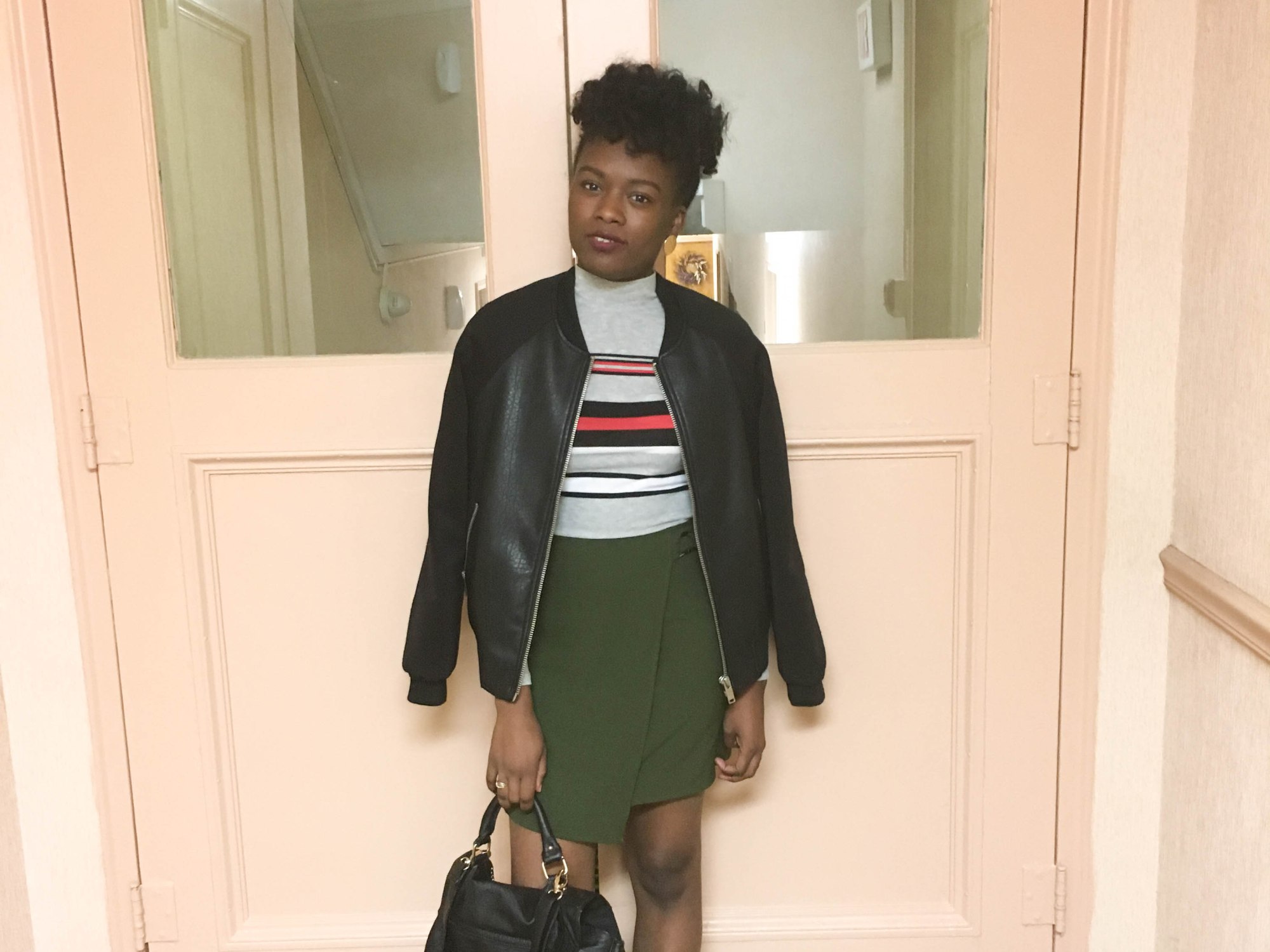For today’s look, I’ve paired my black faux leather bomber with an asymmetrical skirt and a striped tunic shirt. The play on colors for this look is quirky but great! This color combo of green and gray works perfectly together. Although it is more on the chilly side, I couldn’t resist wearing my laced up flats. I finished my look by throwing my bomber over my shoulders and I was ready to go.