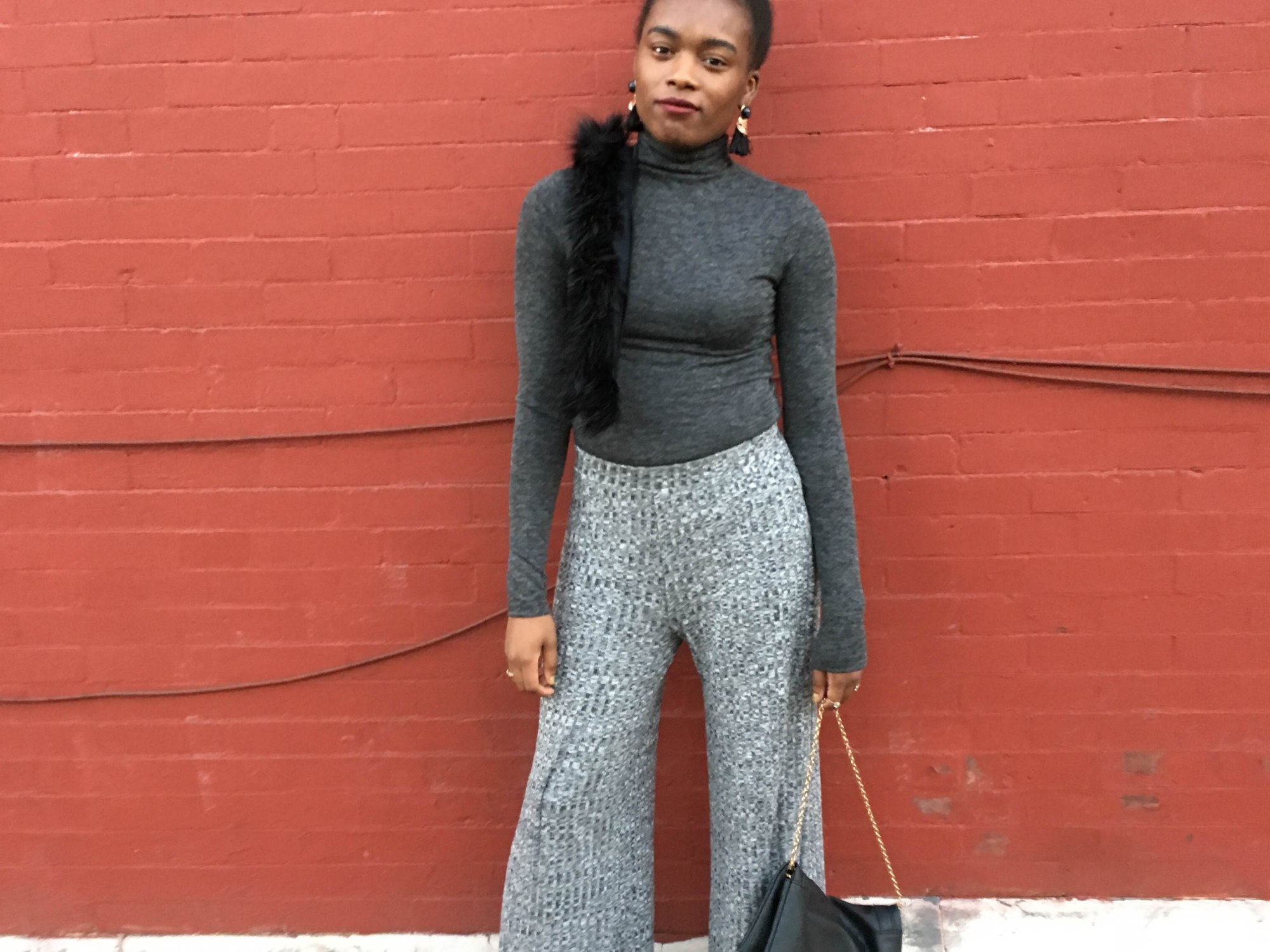 Grey is definitely my go-to color in the winter. I feel like grey is the perfect color for the gloomy weather that we experience on the East coast. Although I love how classic black or white is, grey is my signature. For today’s look, I’d decided to wear to a turtleneck with flared pants. I love the pants because they give off a slight 70’s vibe. To pull the look together, I’d added a black faux fur stole, a clutch, and black booties.