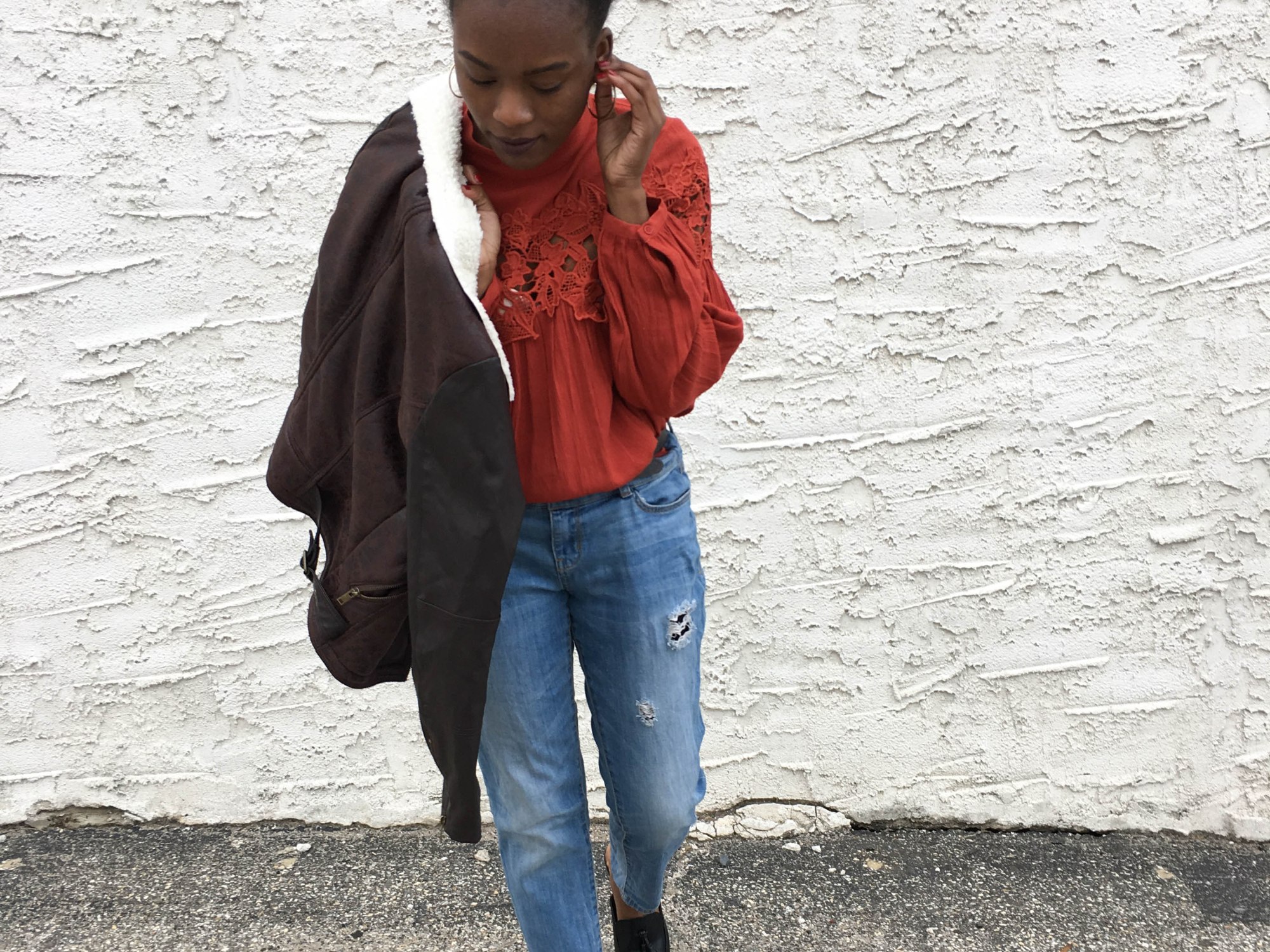 Spring has definitely been on my mind lately. I’m yearning for a change in the weather and longer daylight hours. For today’s post, I decided to bring the spring feels into my look. I have been obsessing over mules and I was overly excited when my pair came in the mail this past weekend. Not only are mules comfortable, they are chic. The tassels in the front of the shoes give the shoes an oomph. For my top, I chose my favorite thrift store find, a burnt orange floral blouse. I love the details on the front and on the sleeves. Paired with a lightly distressed mom jean and a shearling jacket. I was out the door pretending it was finally spring while freezing my toes off.