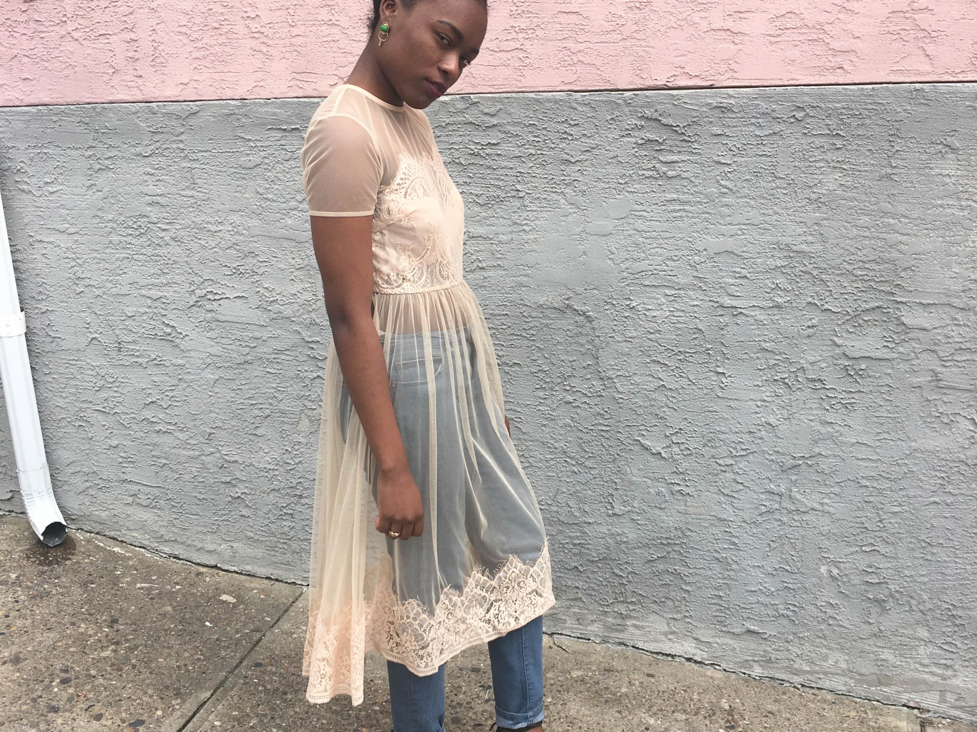 Lately I’ve been obsessing over the dress over denim trend. I decided to switch the look up with a sheer dress. This midi length dress is perfect because you can wear it alone, with pants or even with a skirt. To finish off my look, I’ve paired the dress with a leather jacket and laced up flats.