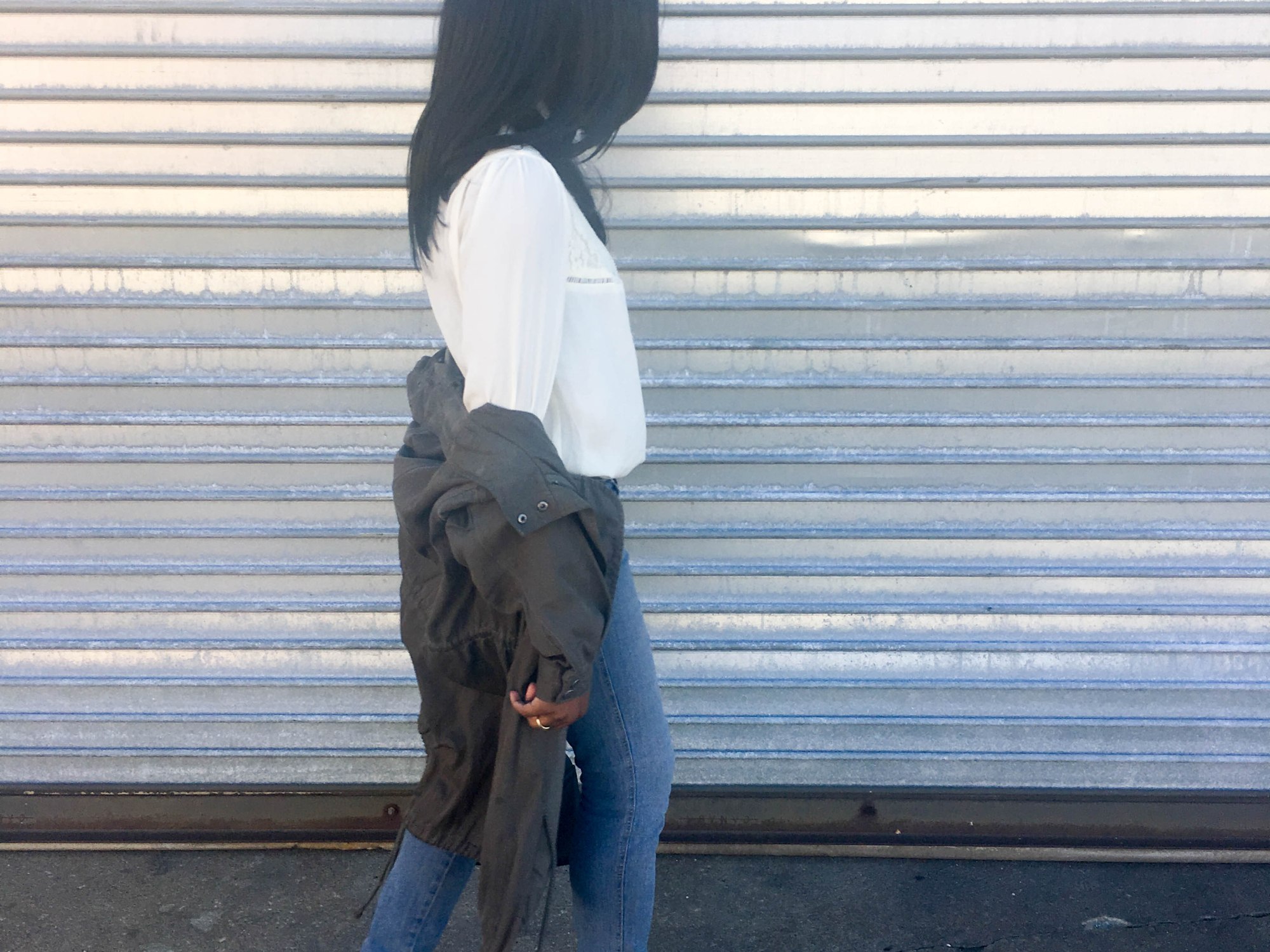 For today’s look, I’ve paired a Victorian blouse with denim and nude heels. For my jacket, I worn a dusty green trench. Trench jackets are perfect for spring, not only are they light, they are a great transition piece from cold to warm.