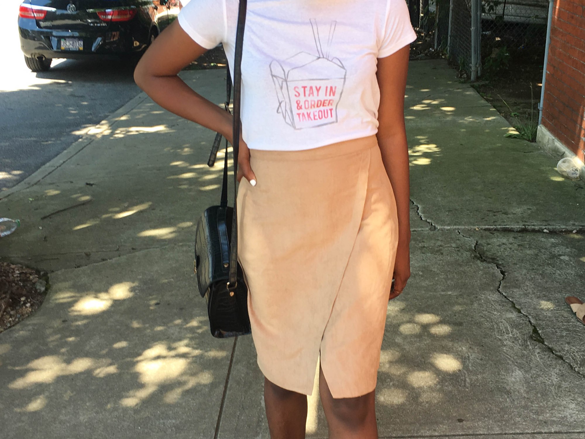 You can never go wrong with a graphic tee, a wrap skirt, heels and a black shoulder bag. This outfit formula is quick and chic for any event. Whether it is for the office, to grab drinks with friends, or for a dinner date, you can’t go wrong!