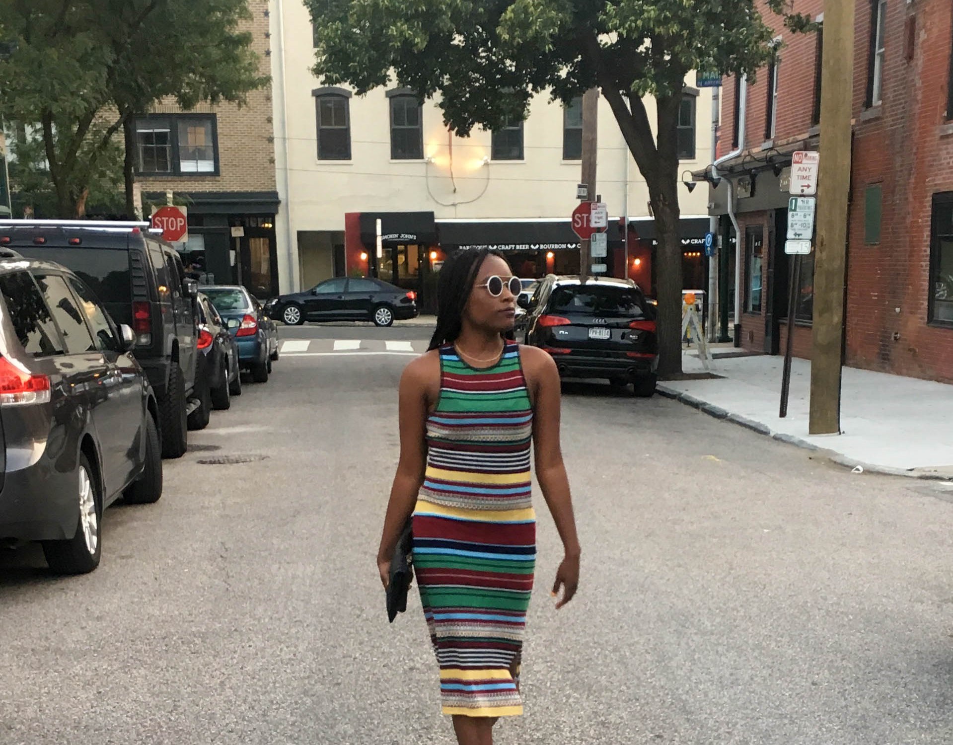 Stripes have been my go-to trend this summer. Although summer is coming to an end, stripes never go out of style. Whether they’re in the form of pants, shorts or a shirt, it’s always a plus to add stripes to your wardrobe. This look is my favorite because of how sporty and chic the dress actually is. I finished the look off with my white vans, black clutch, and white sunglasses.