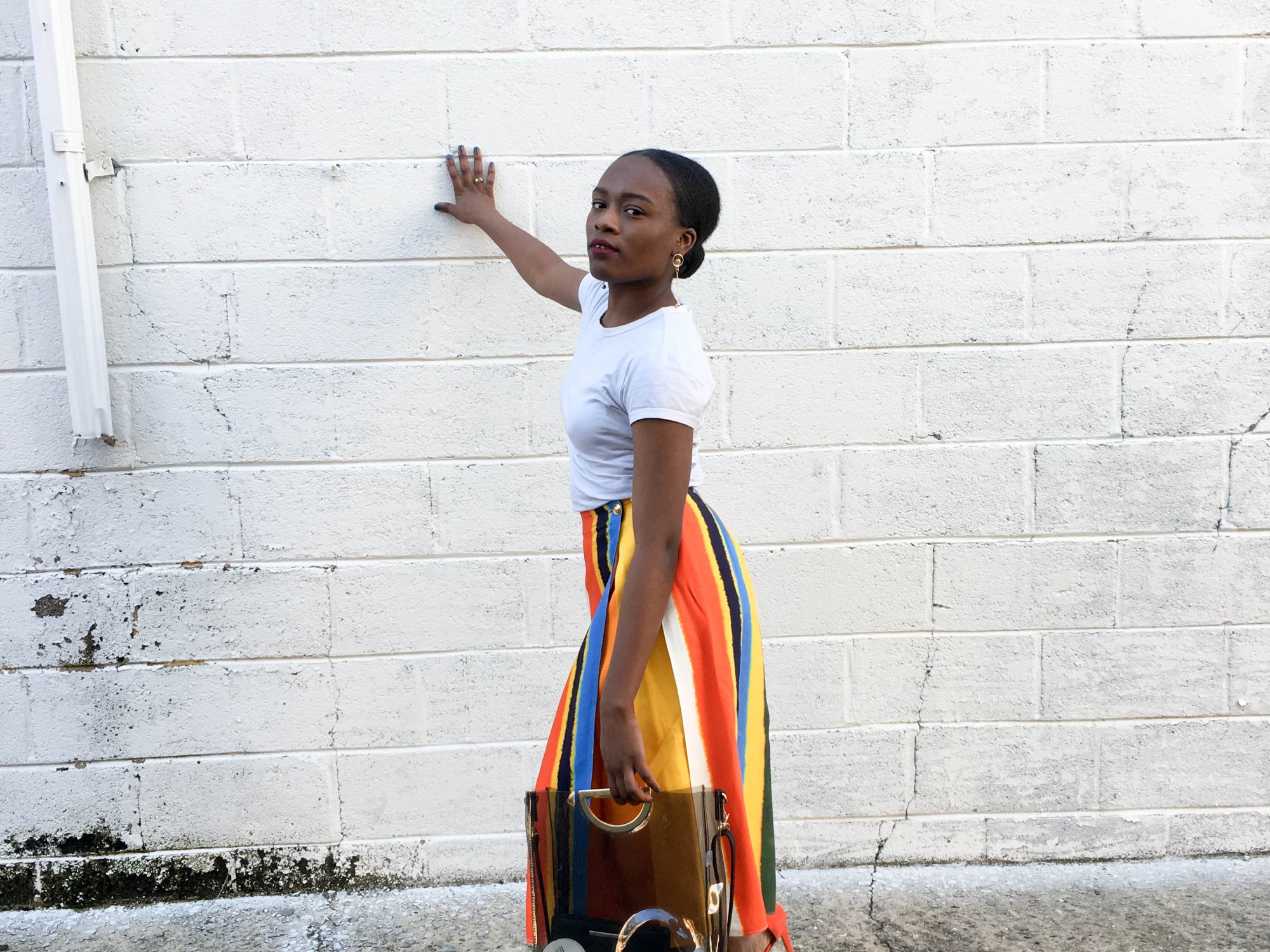 For today’s post, I paired this beautiful multi-striped skirt with a plain tee, heels, a leather jacket and a transparent purse. As my first Spring post, I wanted to showcase my Fun and colorful mood for the season. What would be your mood this season?